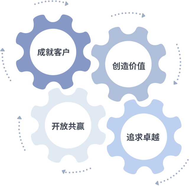 成就客户是一切决策的出发点,,,,创造价值是衡量所有工作的标准,,追求卓越是我们做事做人的态度,,开放共赢是我们的格局也是最终的结果。。价值观的齿轮环环相扣,,推动着组织里的每个人不断向前。。